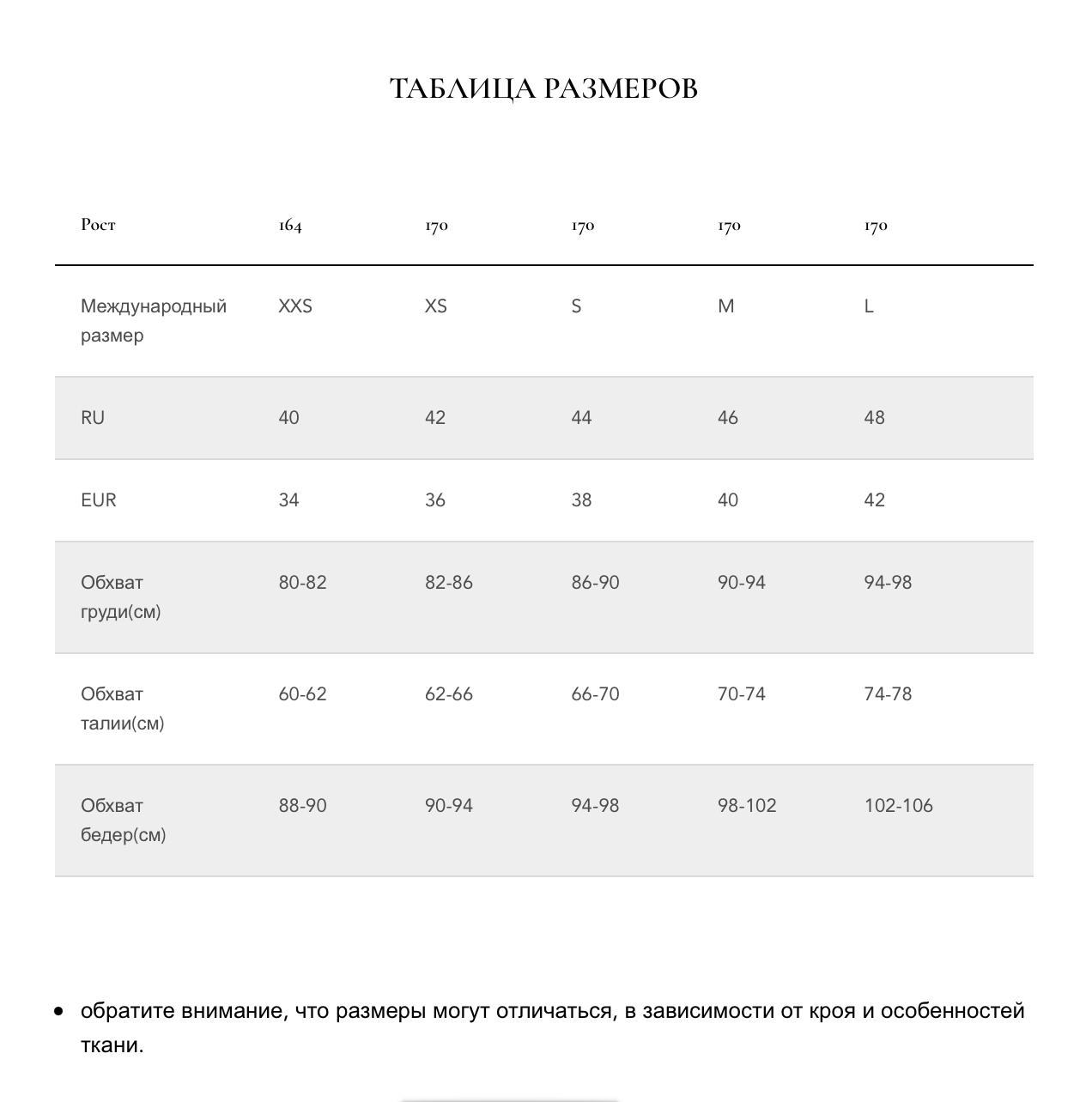 Таблица размеров